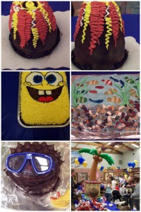 From R to L starting at top row – Volcano Cake, Spongebob Cake, Aquarium, Scuba Diver and our fun and fantastic table setting.