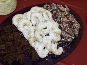 This shot is for my mom…just to prove that I *can* make ethnic baked goods…the middle is a traditional “lokumi” cookie, or for the Greeks in our parish, kourabiedes…the other is good old fashioned American fudge…I finally conquered the high altitude cooking challenge of mushy fudge…this was melt in your mouth, 60% cacao Ghirardelli chocolate fudge…and on the far right…peppermint bark…with milk chocolate instead of white chocolate…because milk tastes better…and because I nuked the white beyond grainy description when I tried to make it late last night…the peppermint bark or the fudge with a cup of coffee…is a little bit of bliss on a busy day, folks!